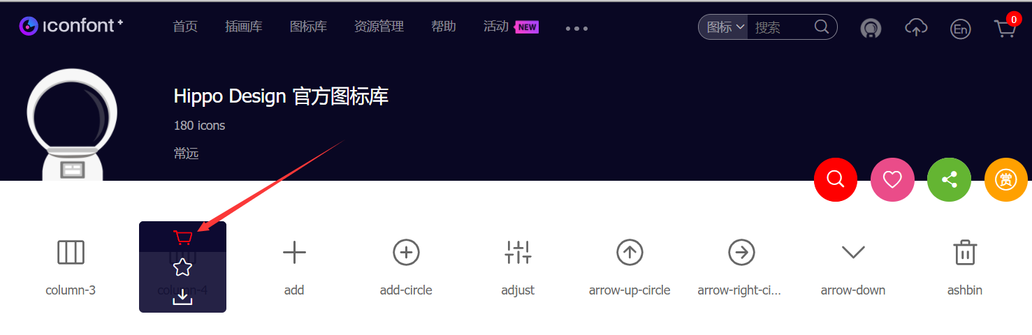 2. 挑选图标 进入首页之后选择菜单栏的【图标库】,然后按下图箭头所指进行自己想要图标的添加,这样会把自己的这些图标添加到购物车。