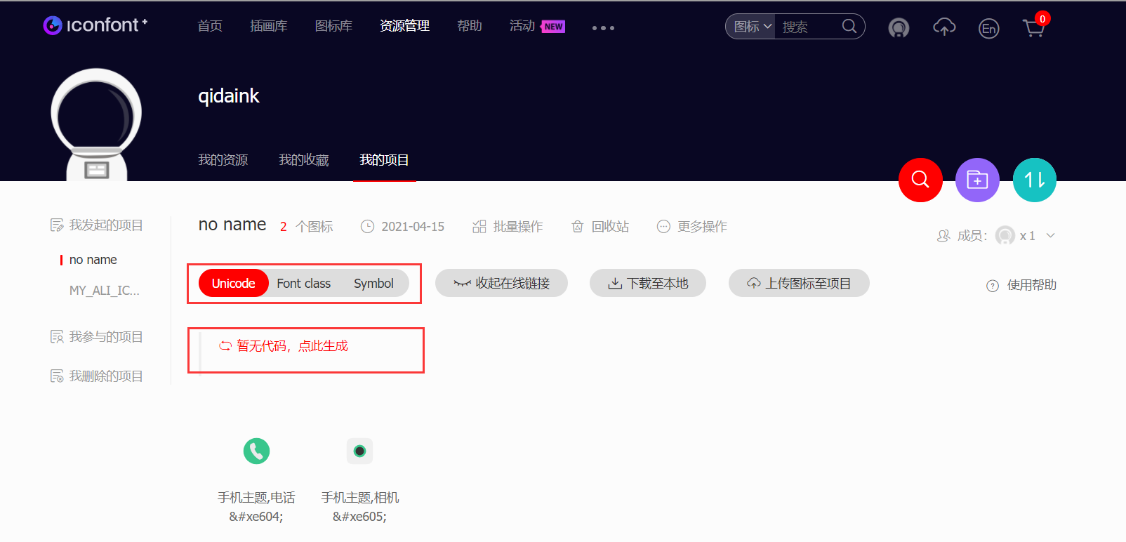 3. 添加到项目 挑选完图标后,点击界面右上角的购物车图标,此时会在右侧弹出如下界面,然后按箭头添加到项目即可,若还未创建项目,则可按照提示进行项目创建,或者自己提前创建好项目,此处不再提示如何创建项目。