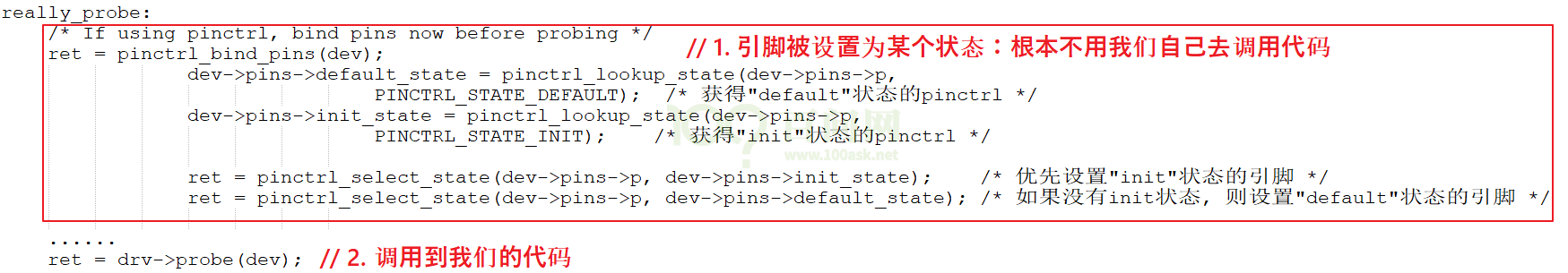 我们的驱动基本不用管。当设备切换状态时,对应的pinctrl就会被调用。比如在platform_device和platform_driver的枚举过程中,流程如下:
