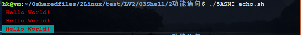 4.使用实例 4.1 echo 1 2 3 4 # !/bin/bash echo -e "\033[31m Hello World! \033[0m" echo -e "\e[31m Hello World! \e[0m" echo -e "\033[31;46m Hello World! \033[0m"