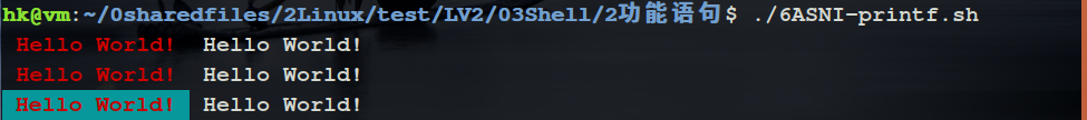 4.2 printf 1 2 3 4 # !/bin/bash printf "\033[31m Hello World! \033[0m Hello World!\n" printf "\e[31m Hello World! \e[0m Hello World!\n" printf "\033[31;46m Hello World! \033[0m Hello World!\n"
